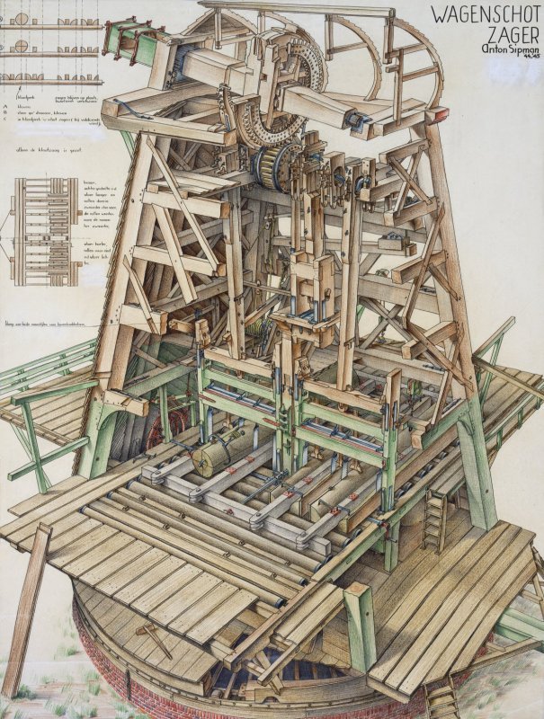 Deze tekening geeft een doorsnede weer van een paltrokmolen, een in Nederland rond 1600 ontwikkelde molenvorm speciaal voor het zagen van hout. Essentieel hiervoor was de uitvinding door Cornelis Corneliszoon van Uitgeest van de meervoudige krukas (boven in de molen), die de zaagramen op en neer kon bewegen. Het krabbelwiel (rood, beneden links op de zaagvloer) zorgde ervoor dat de boomstammen op de juiste manier door de zaagramen werden gevoerd. Geheel onder is te zien dat de complete molen op een soort rollenkrans staat, waardoor ze als geheel in de wind gedraaid kon worden.