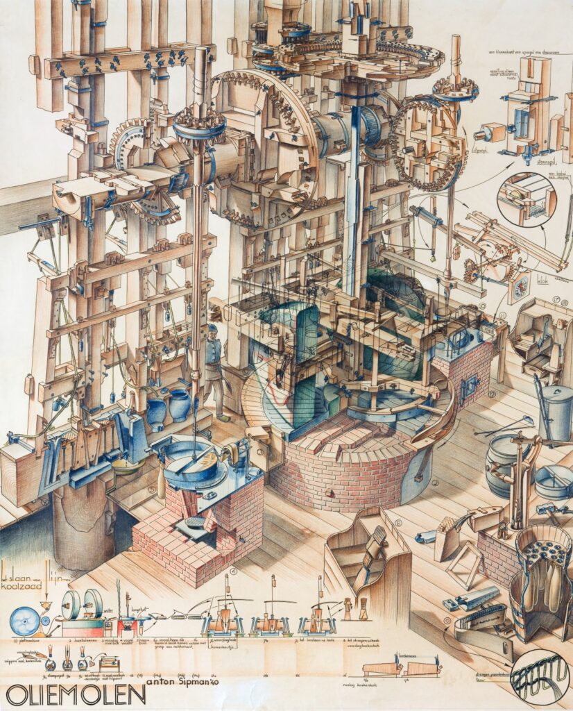 De tekening van de oliemolen laat duidelijk zien welk een complexe techniek zo’n molen kan bevatten. Via de wieken, de bovenas en de centrale koningsspil wordt via steenwiel en steenspil een kollergang met twee enorme verticale stenen in beweging gezet die het kool- of lijnzaad fijn wrijven. De enorme horizontale wentelas zorgt niet alleen voor het heffen en lossen van de heien die de slagkracht leveren om in het slagblok de olie uit het zaad te persen, maar ook voor het draaien van de roerijzers in de vuisterpannen, waarin het fijngewreven zaad wordt verwarmd. De na het slaan overblijvende zaadkoeken worden in potten vergruisd met behulp van heien. Het residu wordt weer verwarmd en vervolgens op het naslagblok nogmaals uitgeperst. De opbrengst is een tweede kwaliteit olie. De dan overblijvende oliekoeken worden verkocht als veevoer.