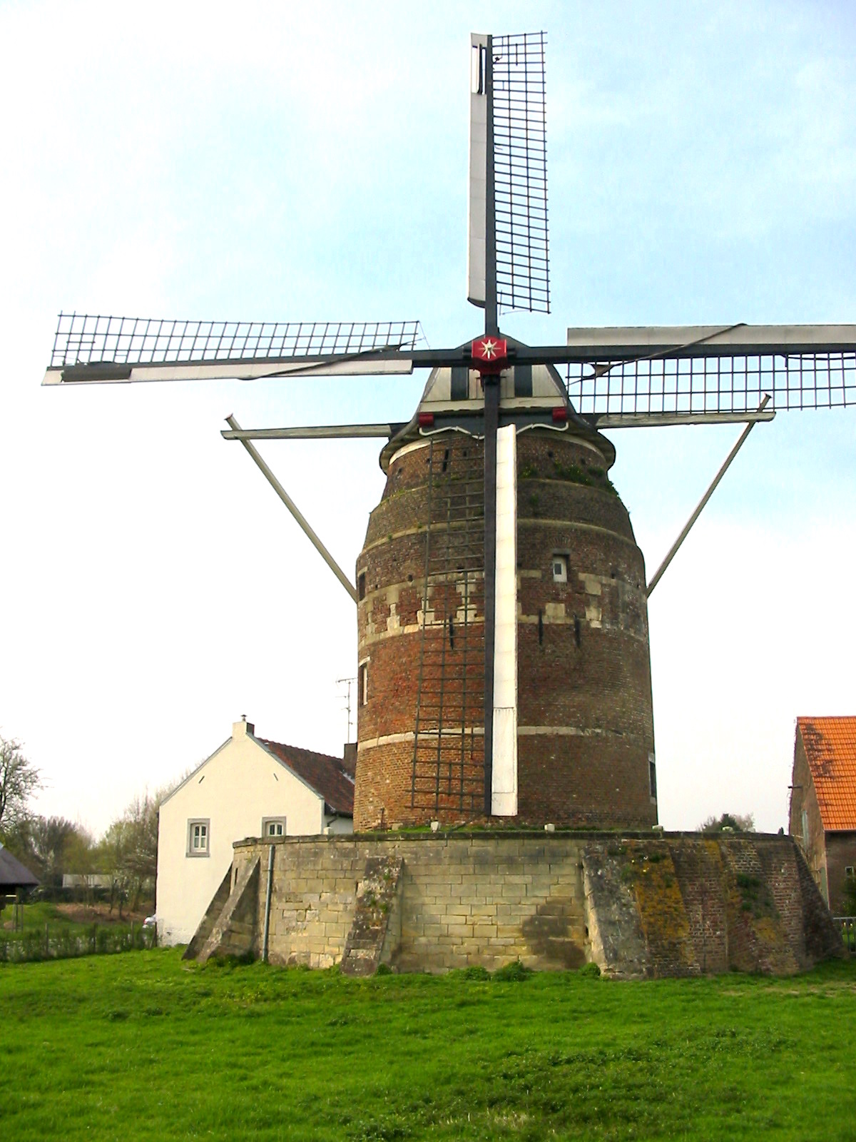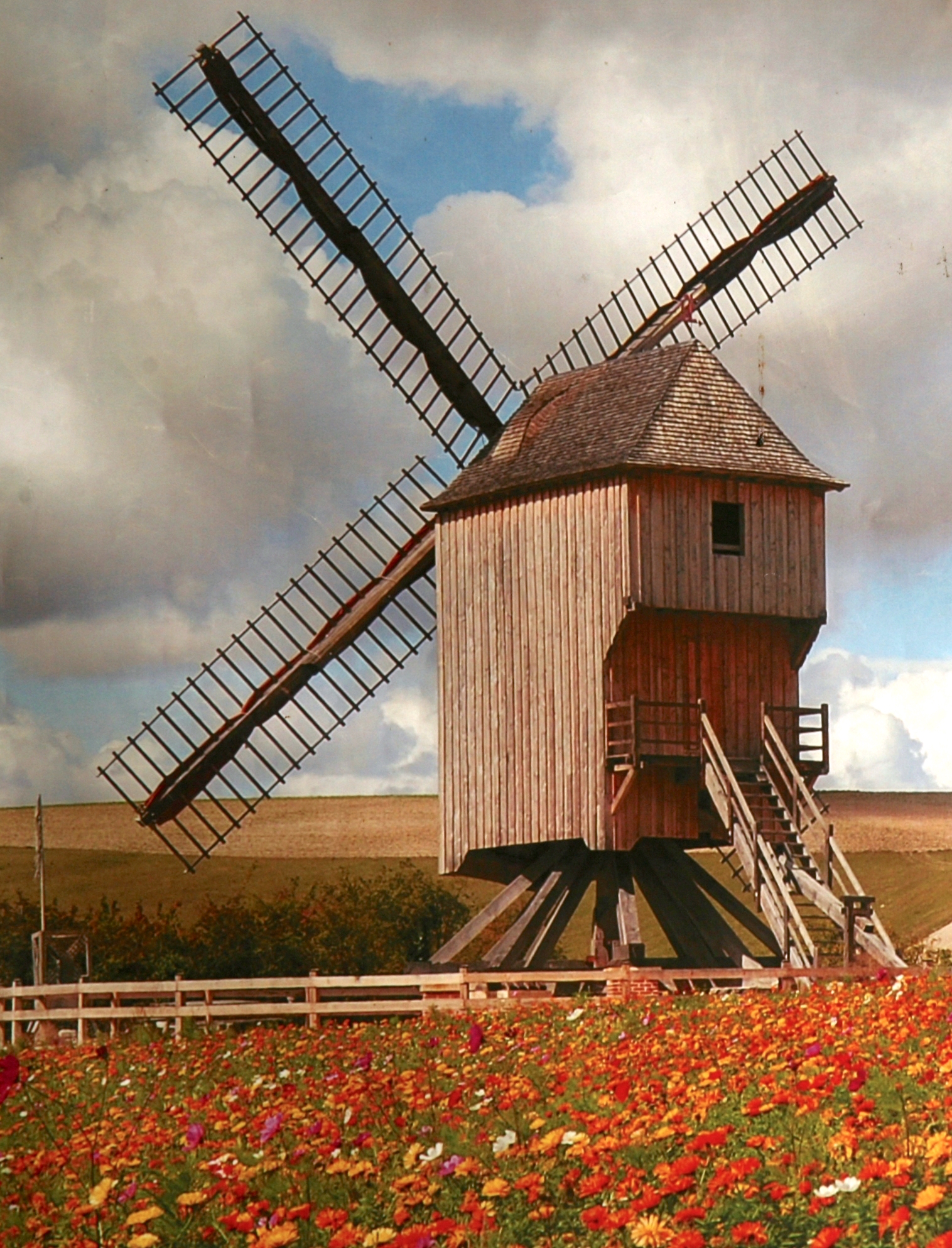 Moulin de Dosches (2004, Dosches, F); replica met dwarsgetuigd gevlucht, zoals de windmolens in de begintijd.